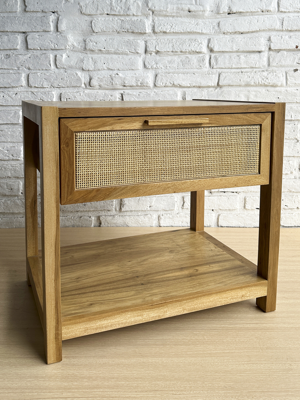 Mesa de luz en madera petiribi 1 cajon esterilla vegetal natural, correderas telescopicas