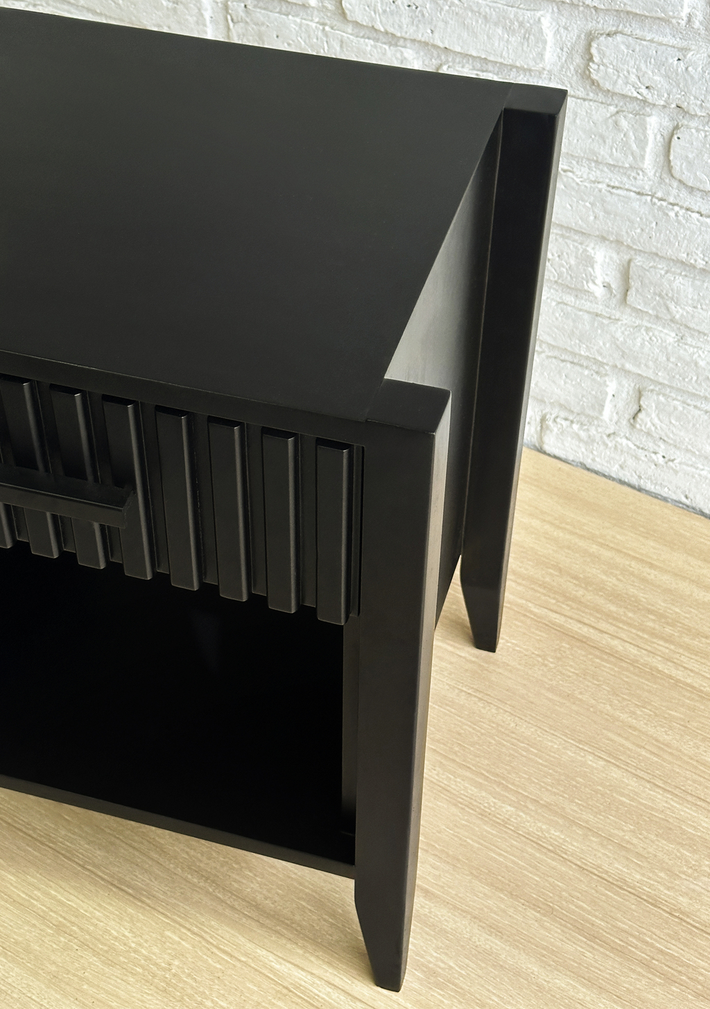 Fabricada en MDF laqueado satinado (blanco o negro) o enchapado en madera petiribí natural.