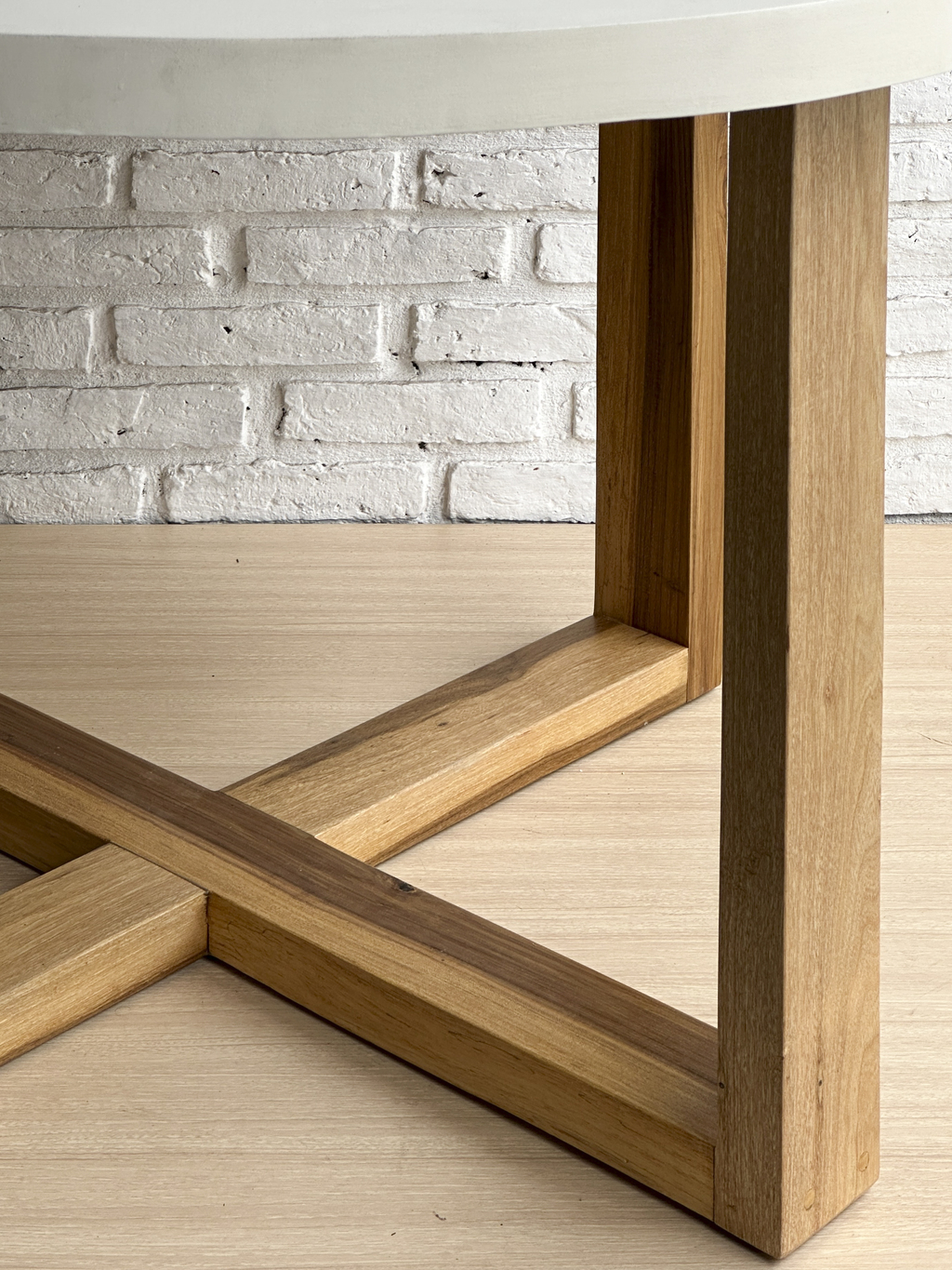 La versión circular de la mesa Emilia mantiene el espíritu sofisticado del modelo original, combinando la solidez de la base en madera maciza de petiribí con la pureza contemporánea del microcemento alisado en su tapa. Esta fusión de materiales crea una pieza única, cálida y moderna a la vez, ideal para ambientes que buscan elegancia sin excesos.