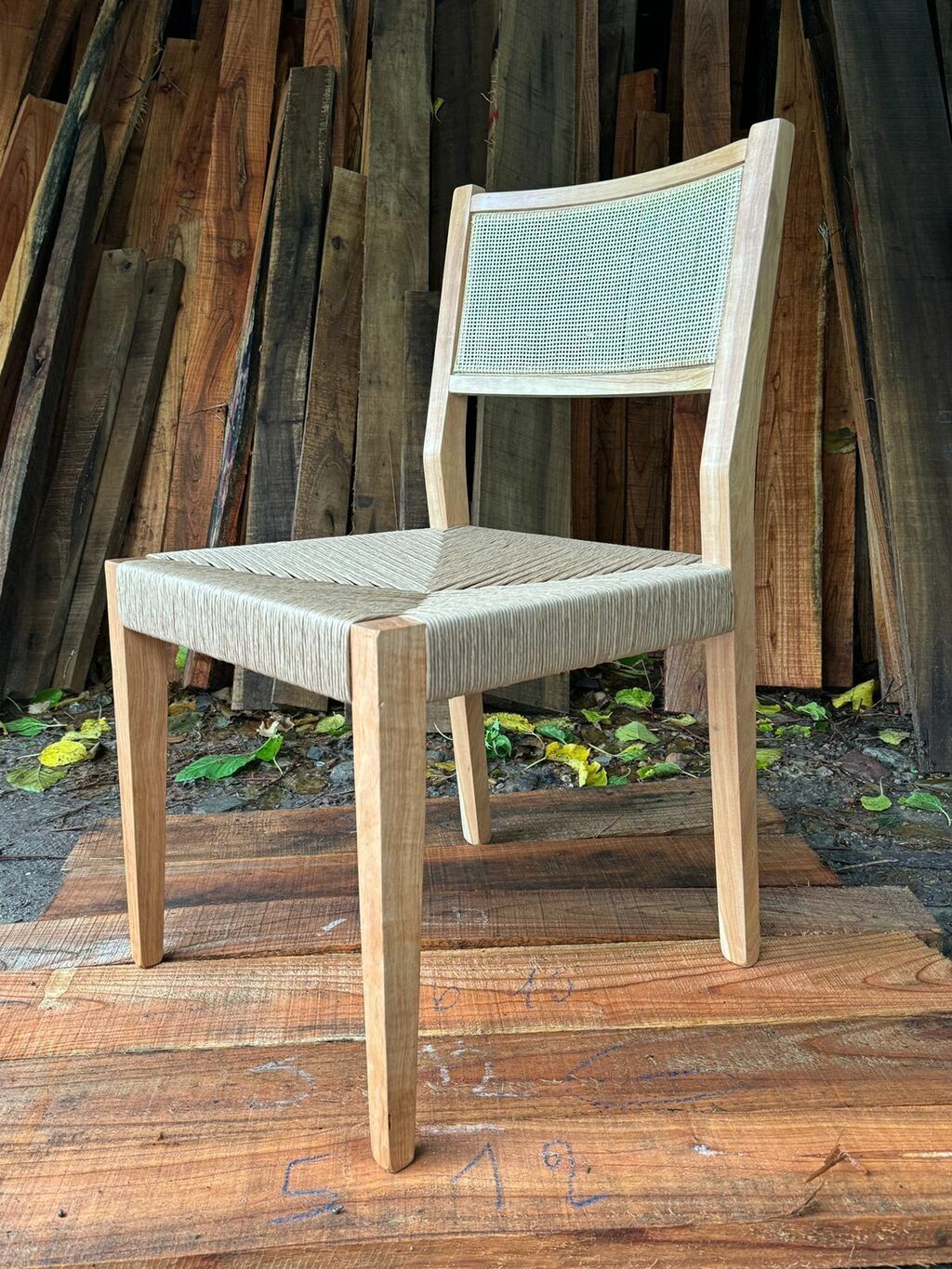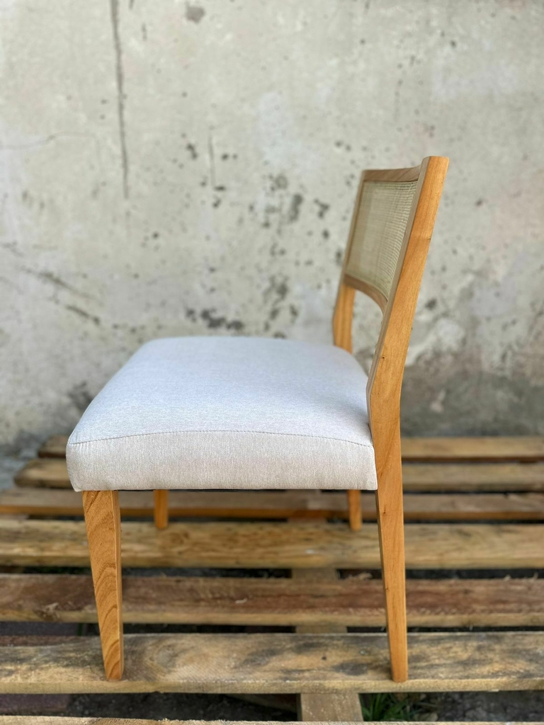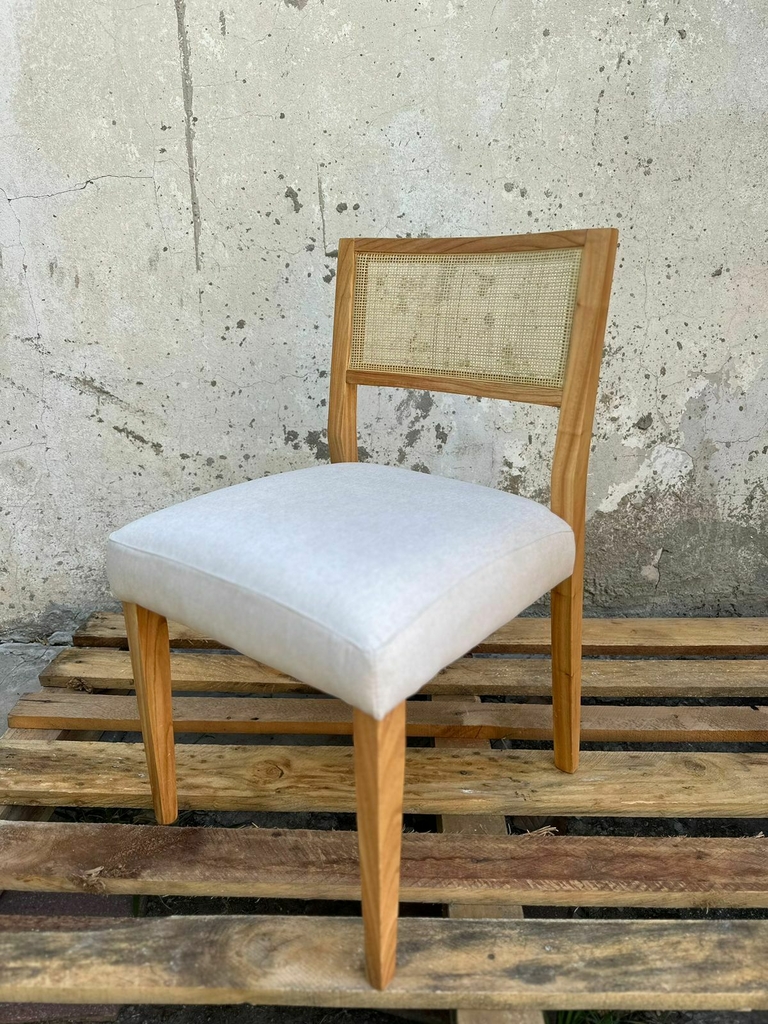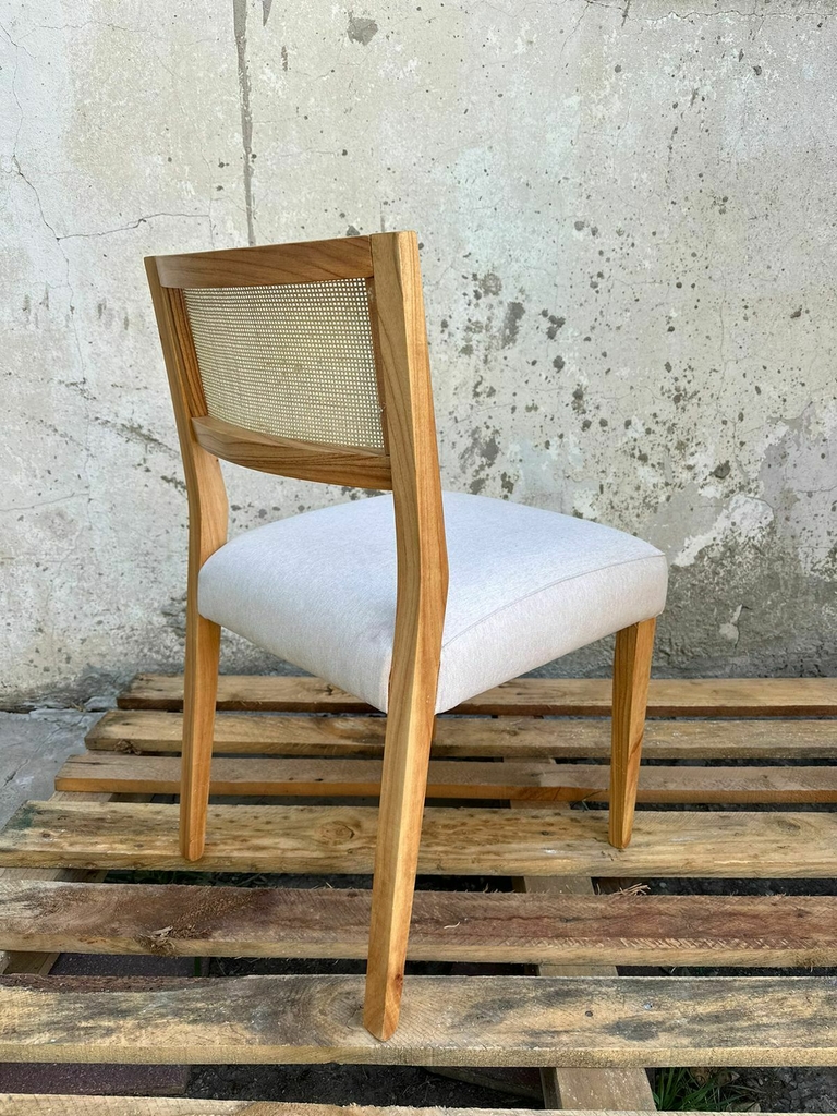 Fabricado en madera maciza de Lenga o Petiribi, lustrado en taller con hidrolaca satinada, tapizada en lino rustico de la mejor calidad